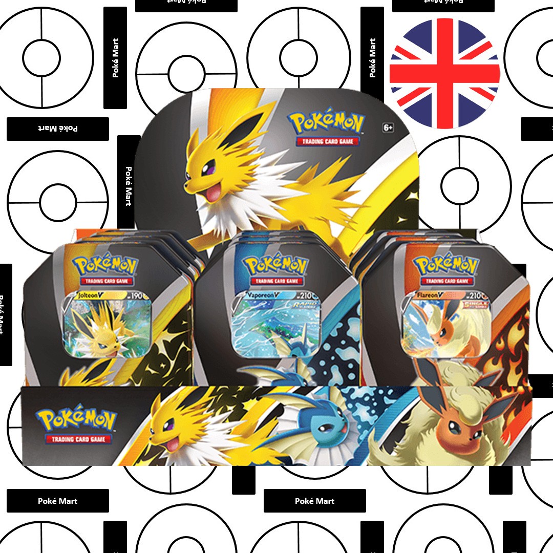 Escolhe o poder rápido do Vaporeon V do tipo Água, a energia estimulante do Jolteon V do tipo Relâmpago ou as chamas concentradas do Flareon V do tipo Fogo na Eevee Evolutions V Tin! Cada uma destas latas coloridas contém uma mão-cheia de tesouros do Pokémon TCG, juntamente com um Pokémon pronto a provar o seu valor em batalha! Estes deslumbrantes Pokémons são todos uma evolução do Eevee, pelo que o Eevee pode evoluir para múltiplas variantes, consoante a situação. Existem ainda mais evoluções de Eevee, como Sylveon, Leafeon, Espeon, Glaceon e Umbreon. Estes são Pokémons muito populares e procurados pelos coleccionadores.