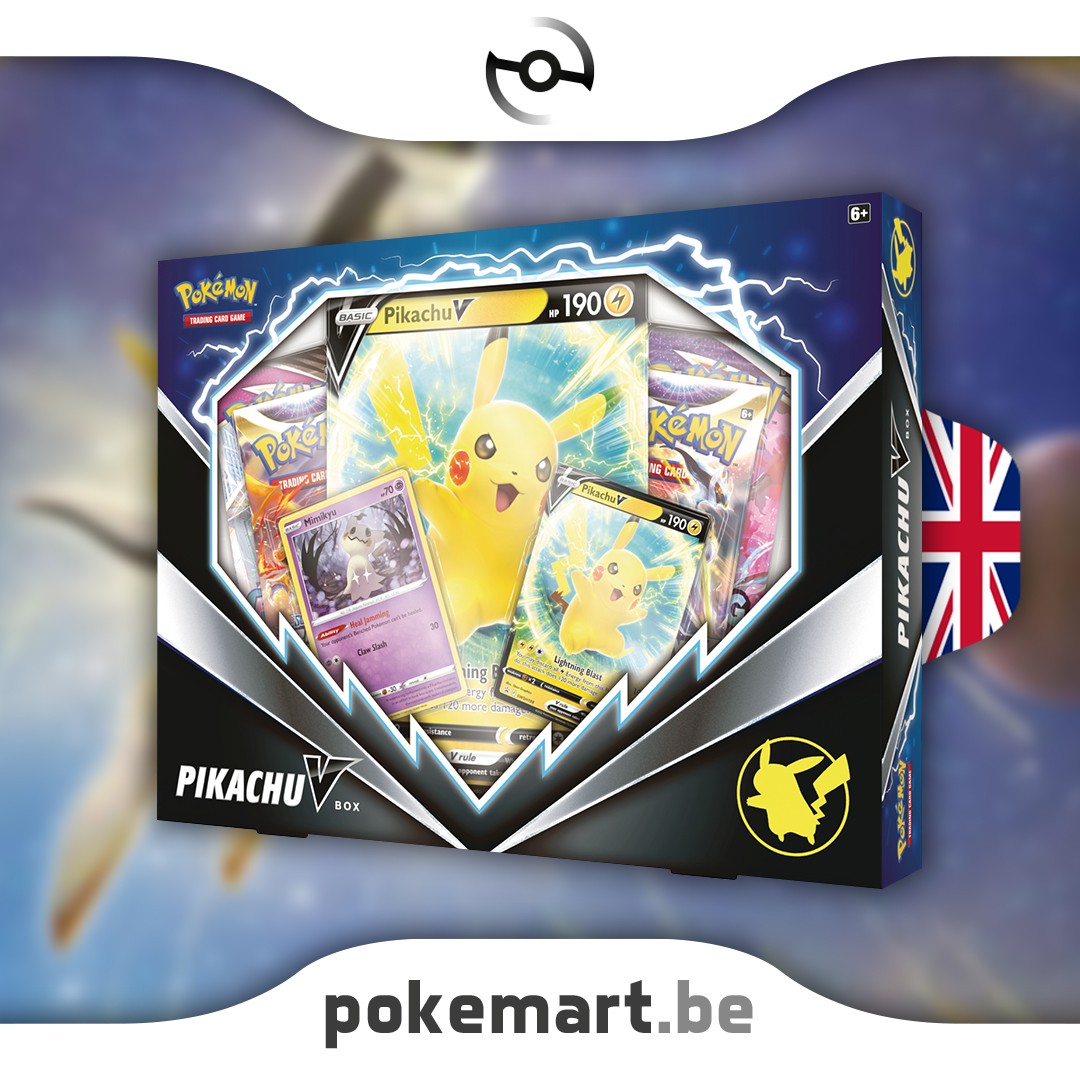 A caixa contém o Pikachu V e o Mimikyu! Além disso, receberá muito mais: um cartão de alumínio extra-grande com o Pikachu V, quatro pacotes de boosters do Pokémon TCG e um cartão de código para o Pokémon Trading Card Game Online! A Pikachu Box é uma excelente prenda para os novos e actuais fãs de Pokémon!